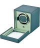 Wolf Cub Seltzer Teal Mint 461140 to nowoczesny rotomat przeznaczony do nakręcania jednego zegarka automatycznego. Model wyróżnia się niebiesko-zieloną kolorystyką oraz eleganckim wykończeniem z wegańskiej skóry Saffiano z recyklingu. Wnętrze wyłożono podszewką z recyklingowanego grogramu, a całość uzupełniają chromowane okucia. Urządzenie oferuje możliwość obrotów w prawo, w lewo oraz w obu kierunkach, co pozwala dopasować jego pracę do różnych mechanizmów zegarków. Zastosowano opatentowane programy obrotów z fazami pauzy i uśpienia, które wspierają prawidłowe działanie mechanizmu. Rotomat posiada również funkcję 10-sekundowego opóźnienia startu. Urządzenie może być zasilane prądem zmiennym przy użyciu dołączonego uniwersalnego adaptera lub bateriami AA – alkalicznymi albo litowymi, przy czym baterie litowe działają nawet dwa razy dłużej. Baterie nie są dołączone do zestawu.